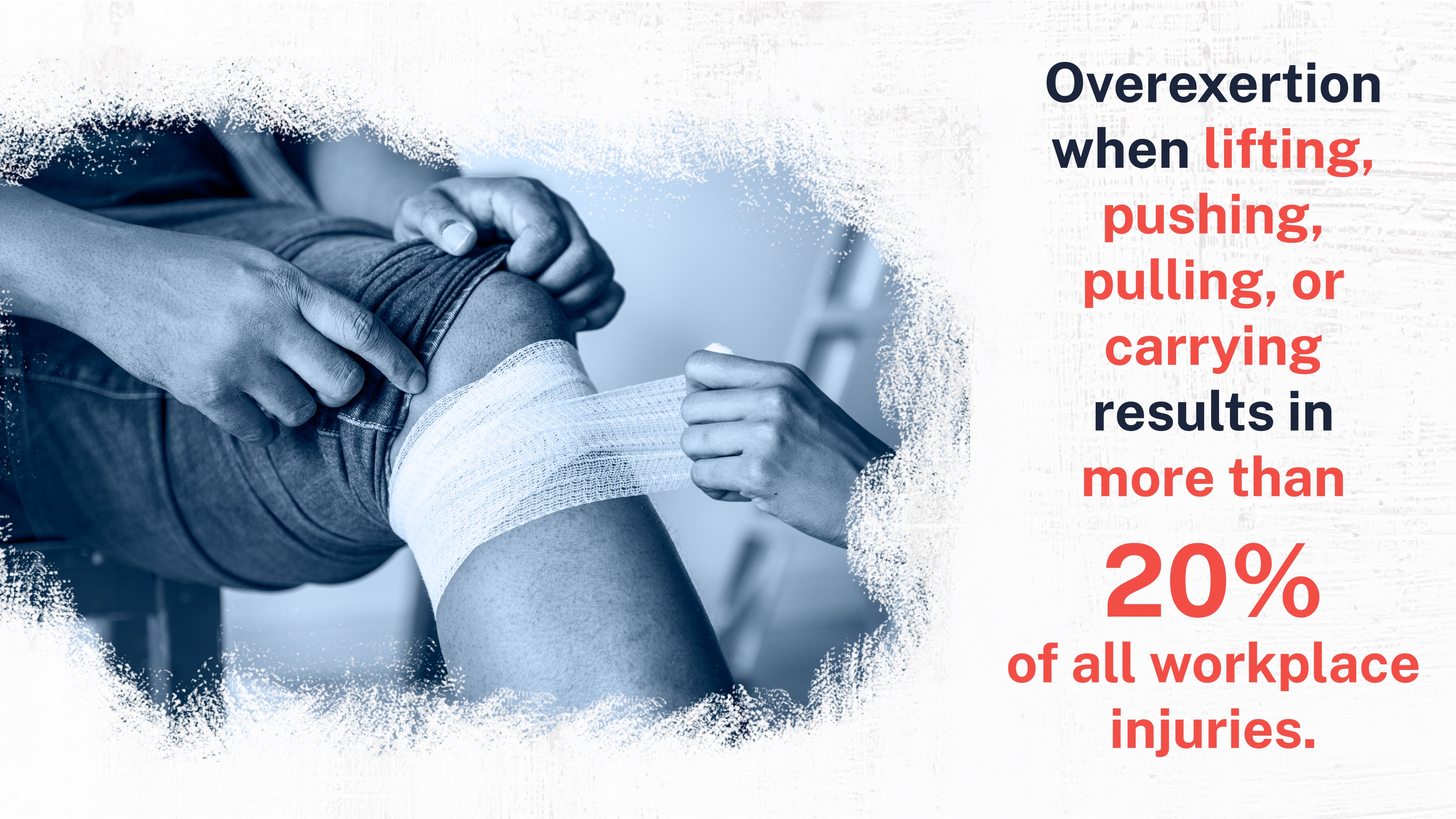 Statistics show that over 20% of all workplace injuries result from overexertion when lifting, pushing, pulling, or carrying. These actions can cause injury immediately if performed incorrectly or lead to injury if performed repeatedly. Employees should be trained in proper lifting techniques and counseled to avoid lifting amounts that are too heavy or dangerous.
