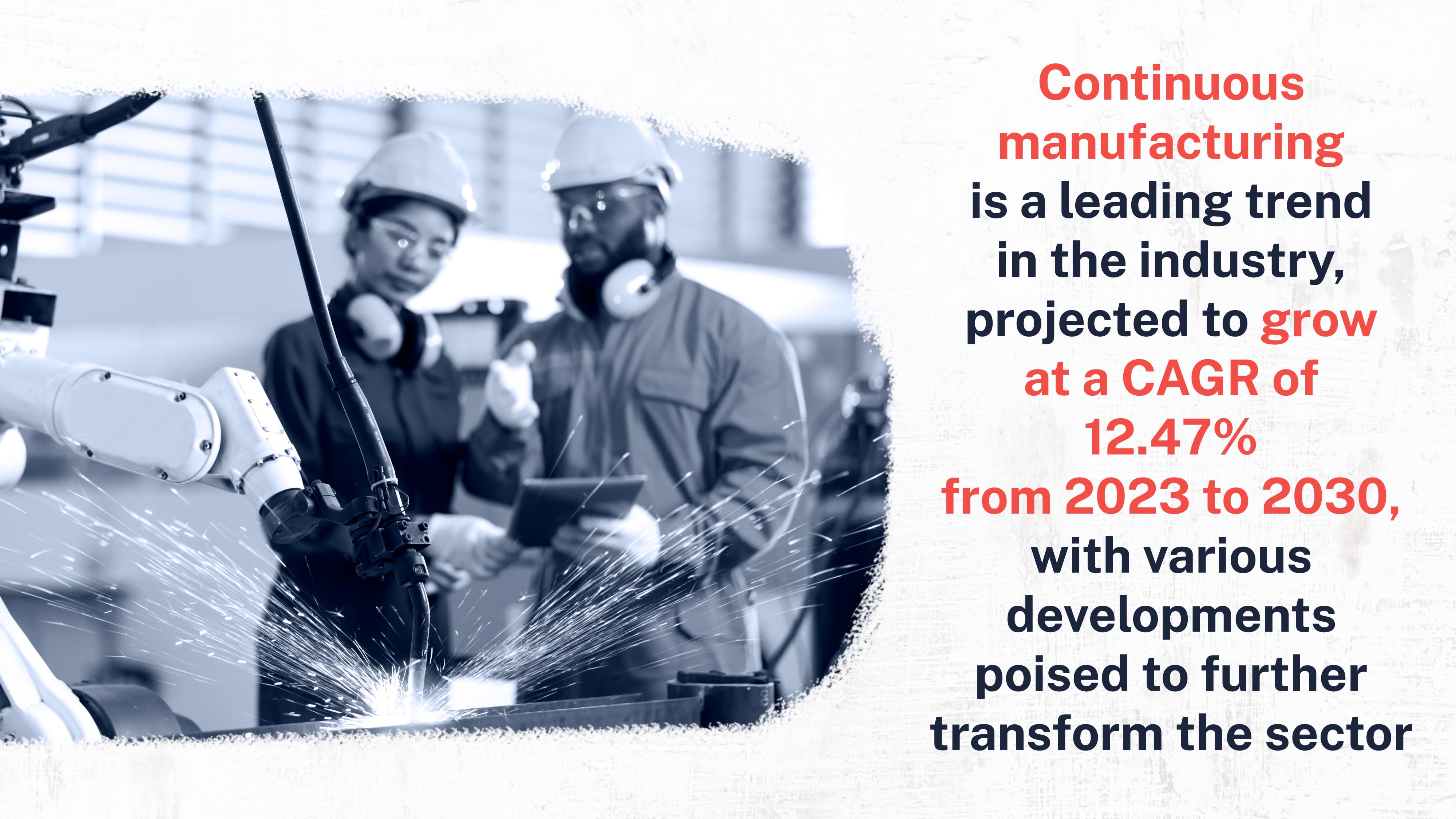 Continuous manufacturing is at the forefront of these trends; the industry is expected to grow at a compound annual growth rate (CAGR) of 12.47% from 2023 to 2030. Not only that, but several developments are poised to transform the industry further.