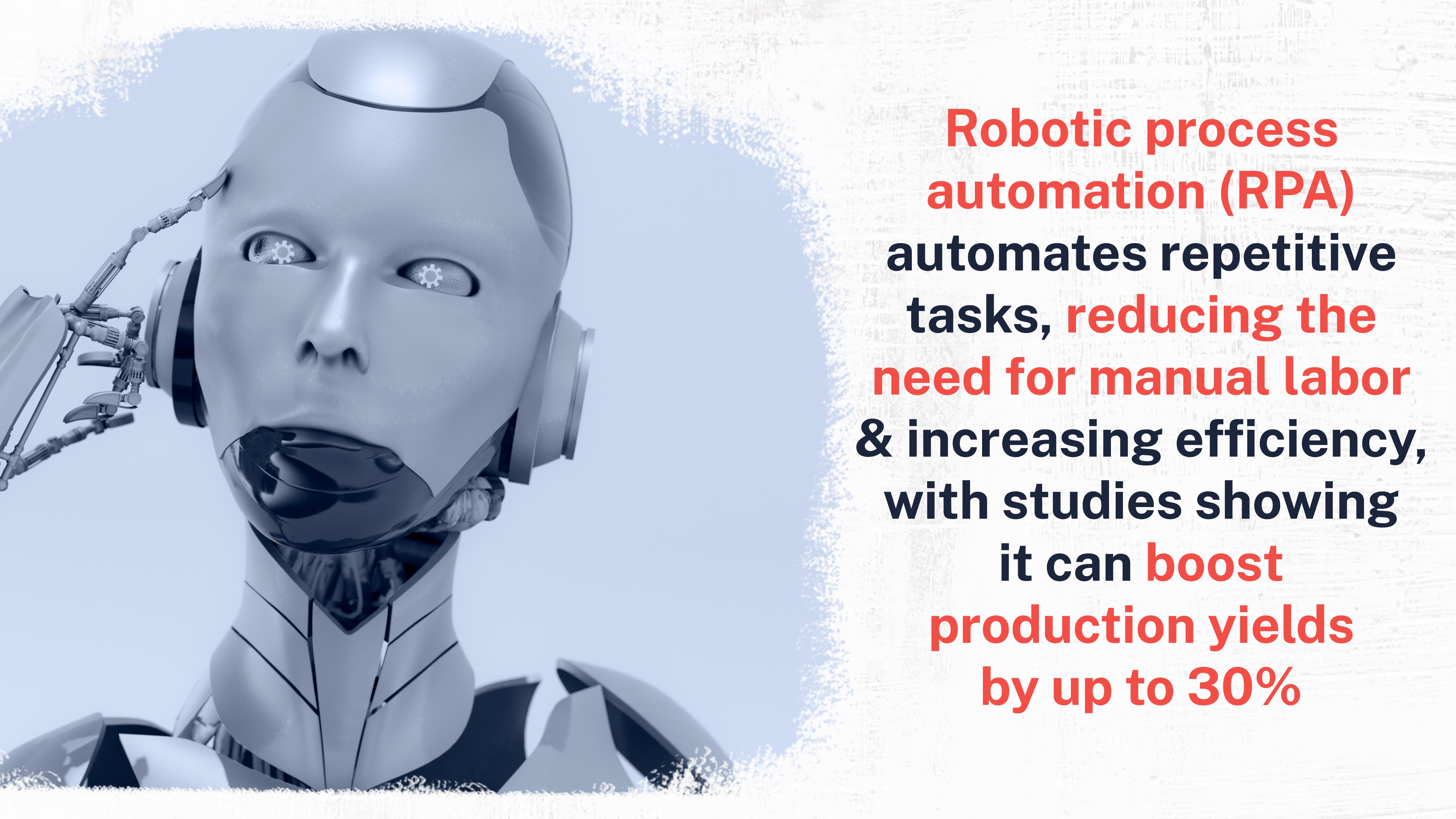 Finally,, we have robotic process automation (RPA), which can automate repetitive tasks that reduce the need for manual labor and increase efficiency. Studies show that RPA can increase production yields by as much as 30%!