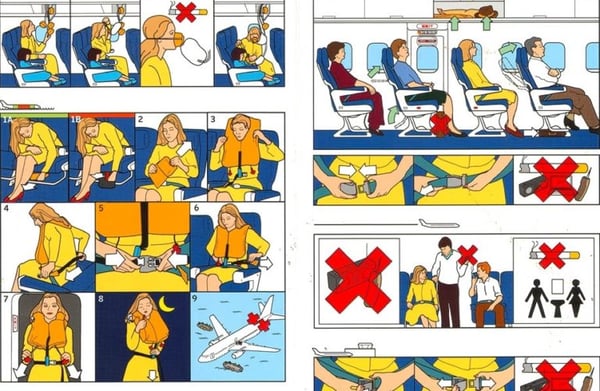 There are many reason why airlines use graphics instead of written steps: graphics don't require translation.