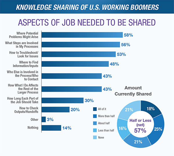 Nevertheless, capturing expert knowledge before it retires is still a challenge for most manufacturers. A recent survey found that 57% of Baby Boomers have shared less than half of the knowledge needed to perform their job responsibilities when they retire. More shocking, 21% have shared none of their knowledge — almost a quarter of a generation’s expert knowledge, which will likely be retiring in the coming years. It’s time for companies to do more to protect their organization and proactively capture expert knowledge before it’s too late.