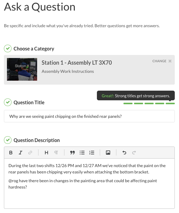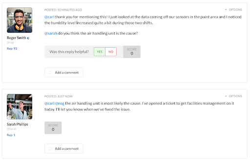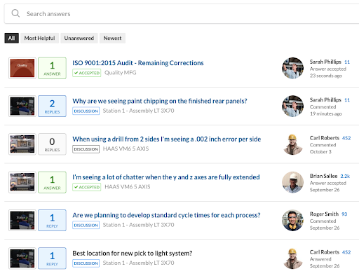 Employees can post a question or problem, associate it with a production line, workstation, or piece of equipment, and request assistance from specific employees or internal experts.