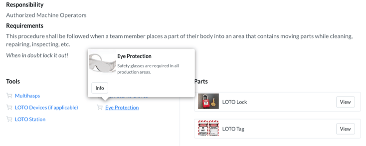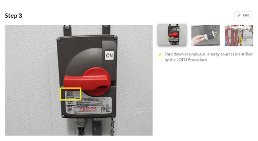 Define your safety equipment and PPE in your LOTO documentation using visuals. OSHA specifies that any required safety gear and personal protective equipment (PPE) be defined clearly and that the employee is provided proper training to use said equipment.