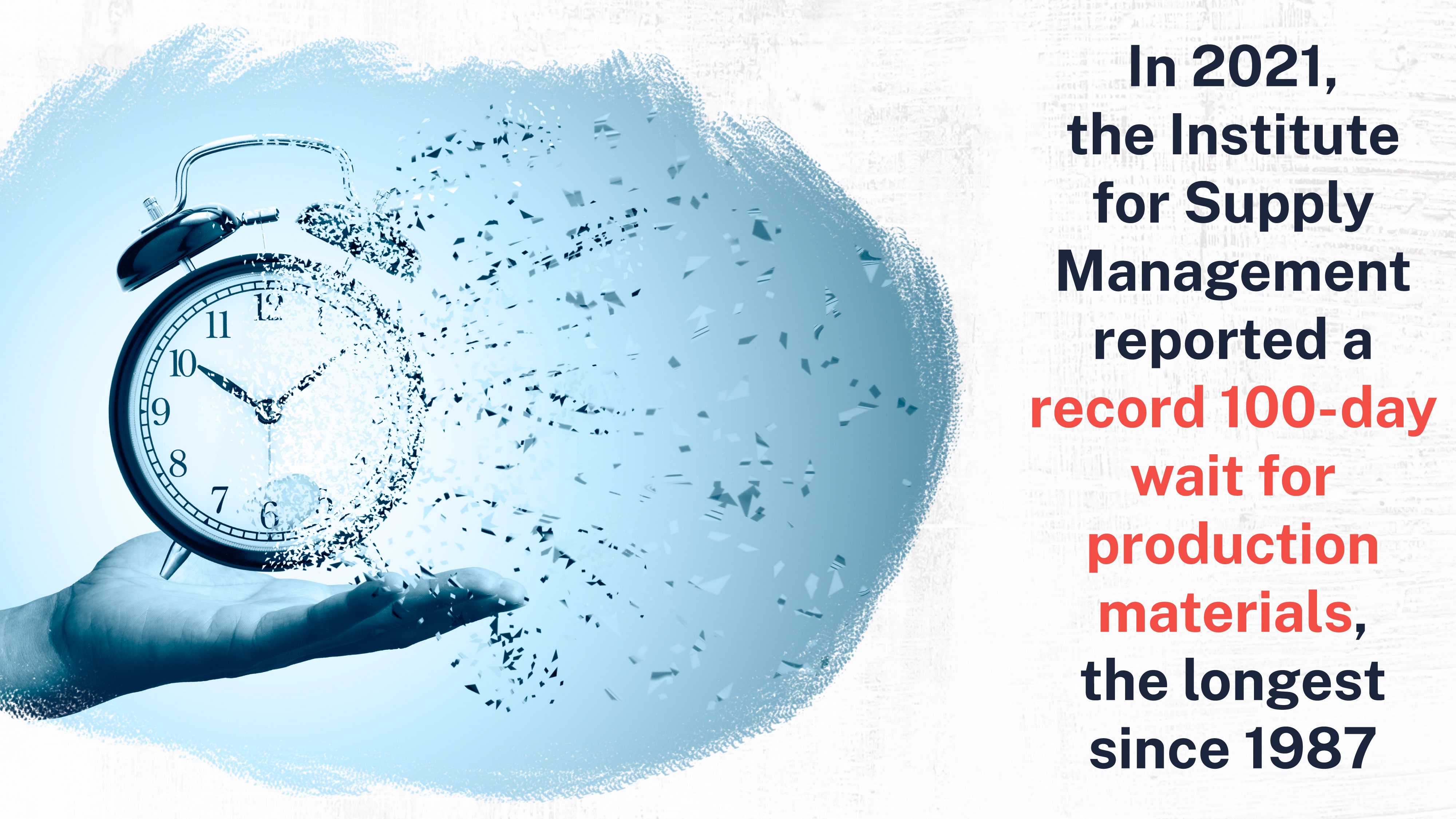 In 2021, the Institute for Supply Management released statistics showing the average time to receive production materials rose to 100 days – the longest window on record since the industry began tracking the figure in 1987.