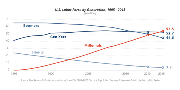 In the United States, 10,000 baby boomers are retiring every day—that’s 4 million a year. The manufacturing industry is particularly affected by this because hiring rates were slow when gen-x (the generation before millennials) was starting their careers. By 2020, 46% of the entire workforce will consist of millennials. As baby boomers in the manufacturing industry retire at an increasing rate, these younger generations will be needed to fill their vacancies.
